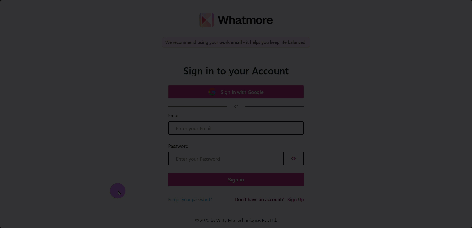 Changing your password helps keep your account secure and ensures you maintain full control over your Whatmore AI Studio workspace. Since there is no option to update your password inside the platform, you will need to log out and reset it through the login page.