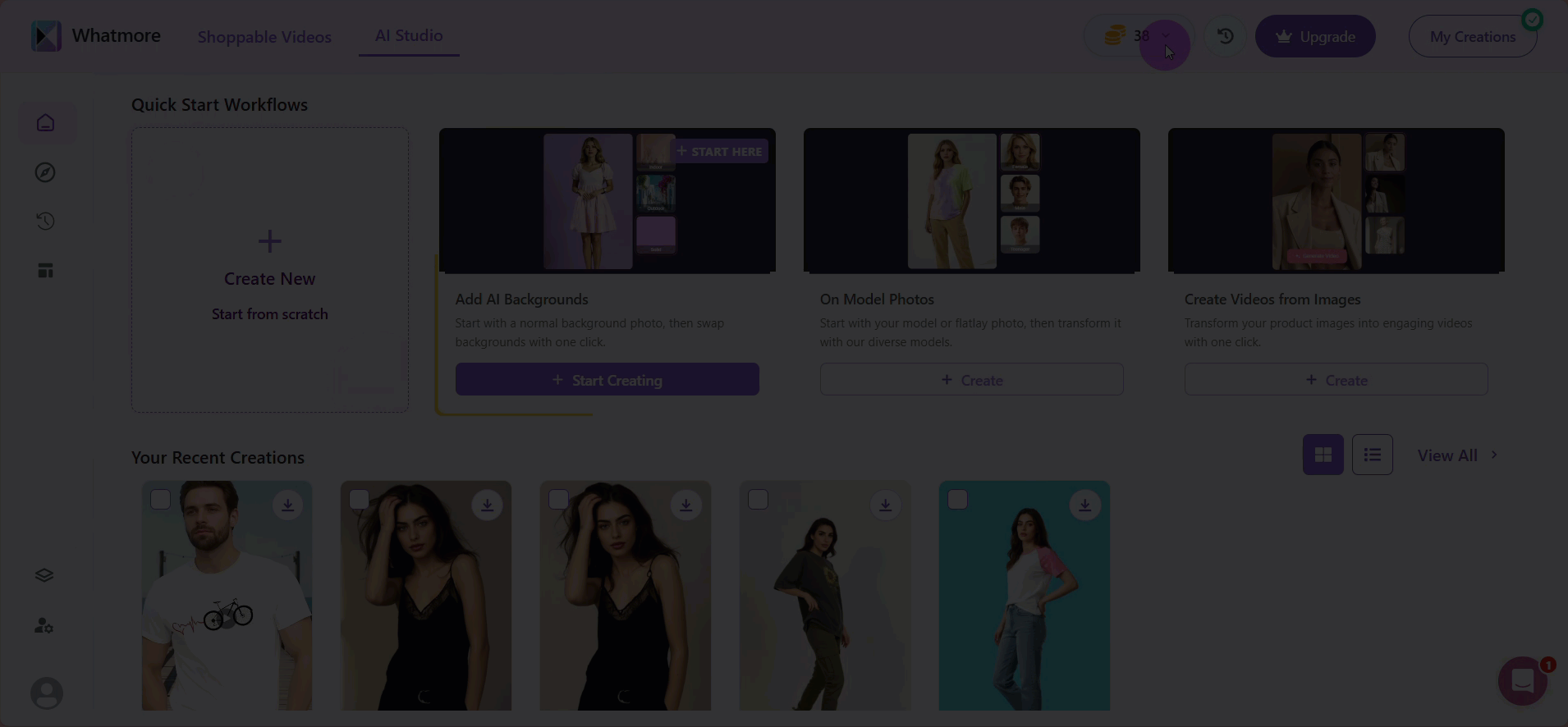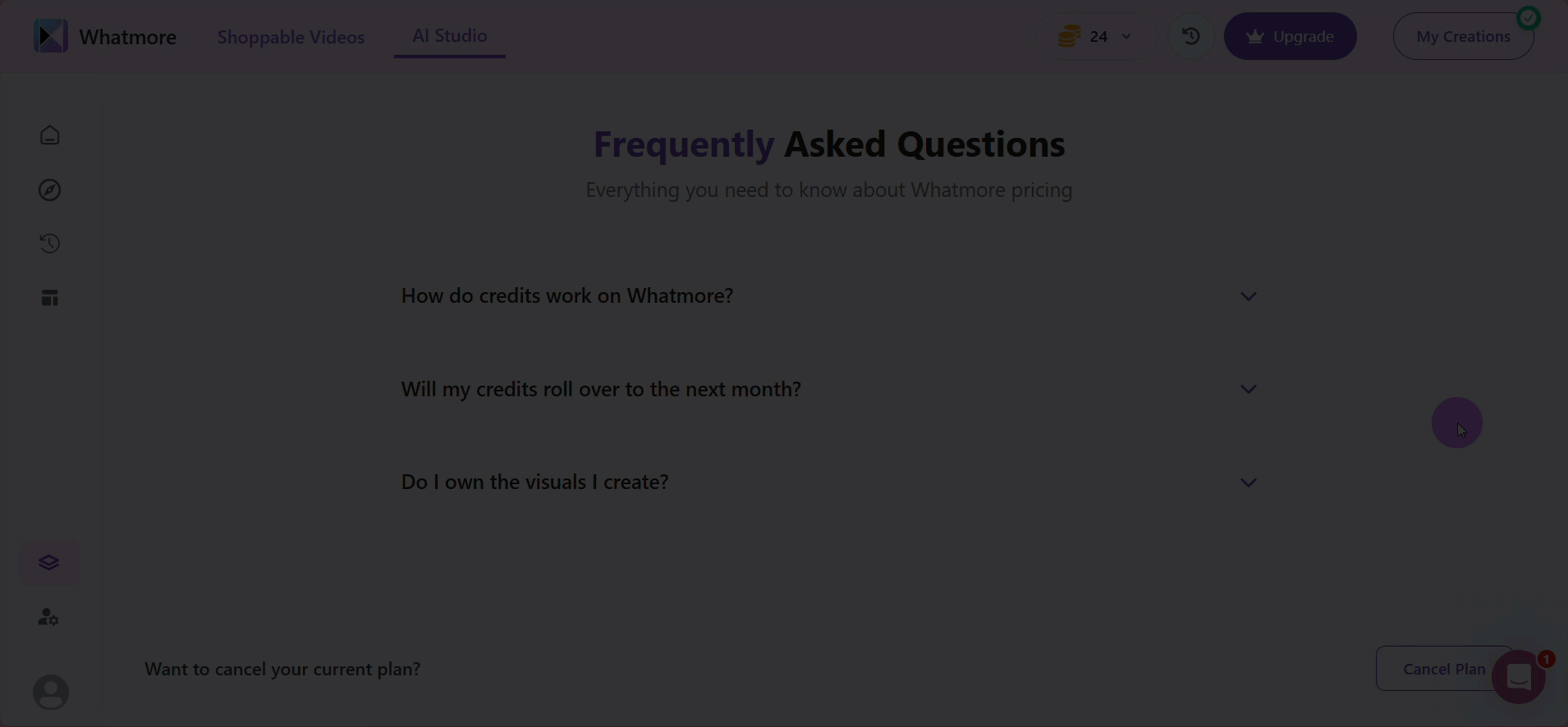Managing your credits and plan effectively ensures smooth creative production, helping you stay on track with campaigns and maximize the benefits of Whatmore AI Studio.