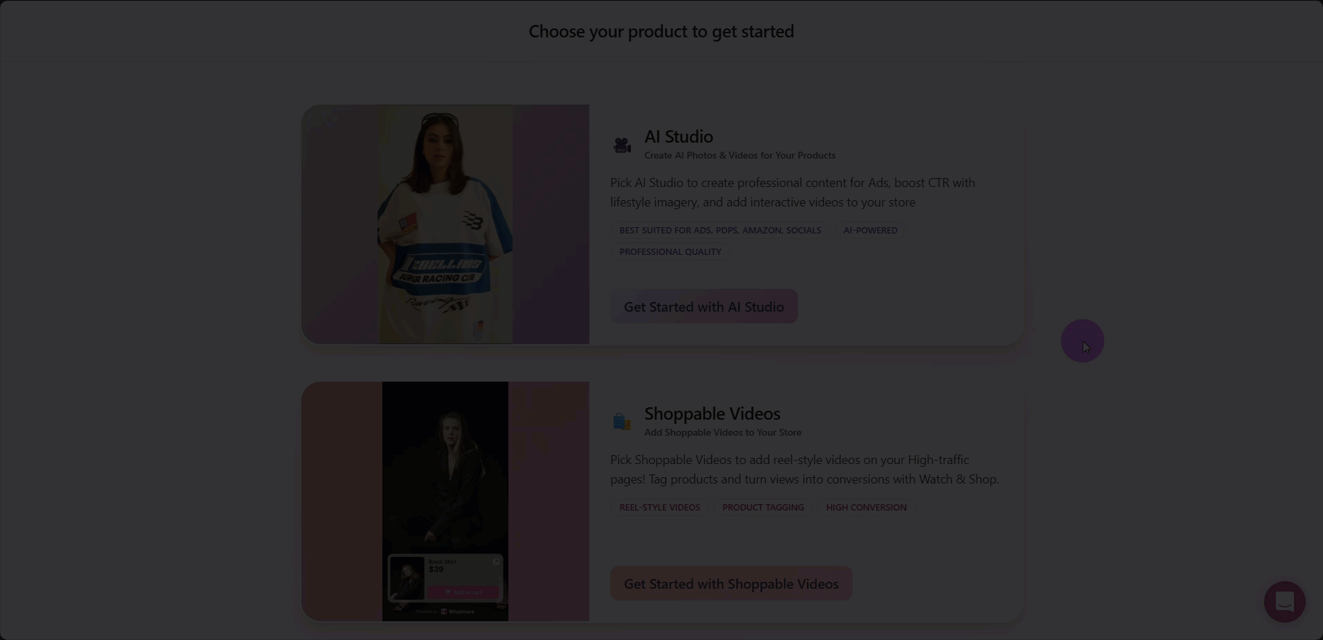 1. Choose Get Started with AI Studio or Get Started with Shoppable Videos to start creating images and videos. You will have access to all features.