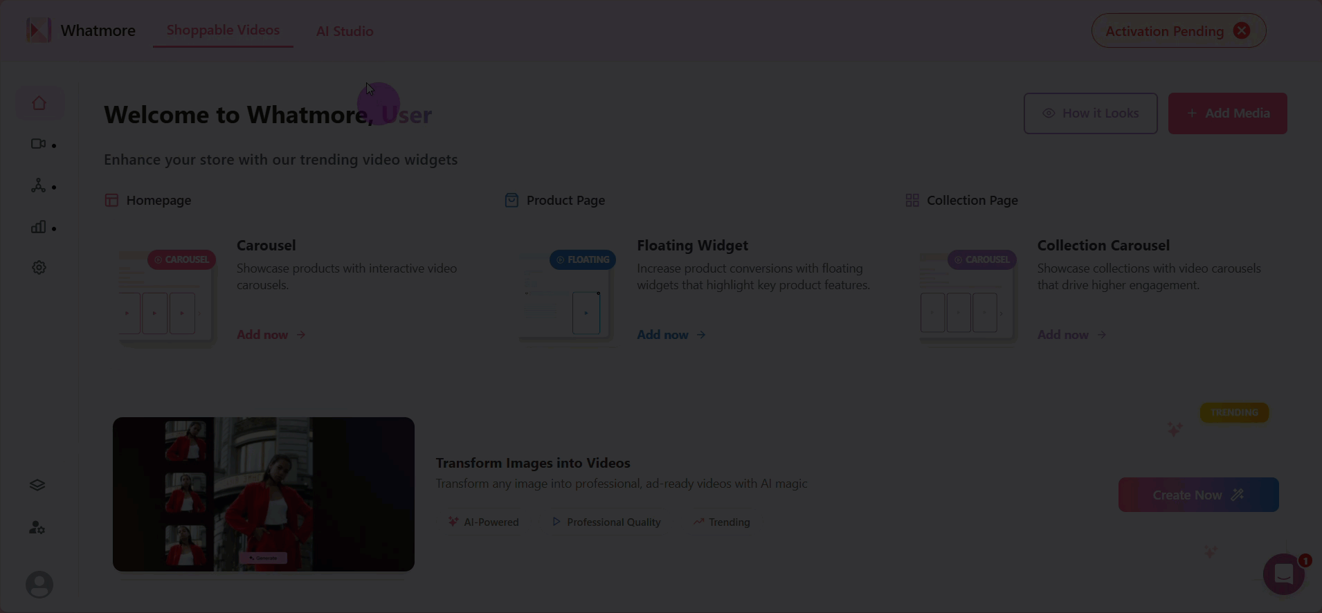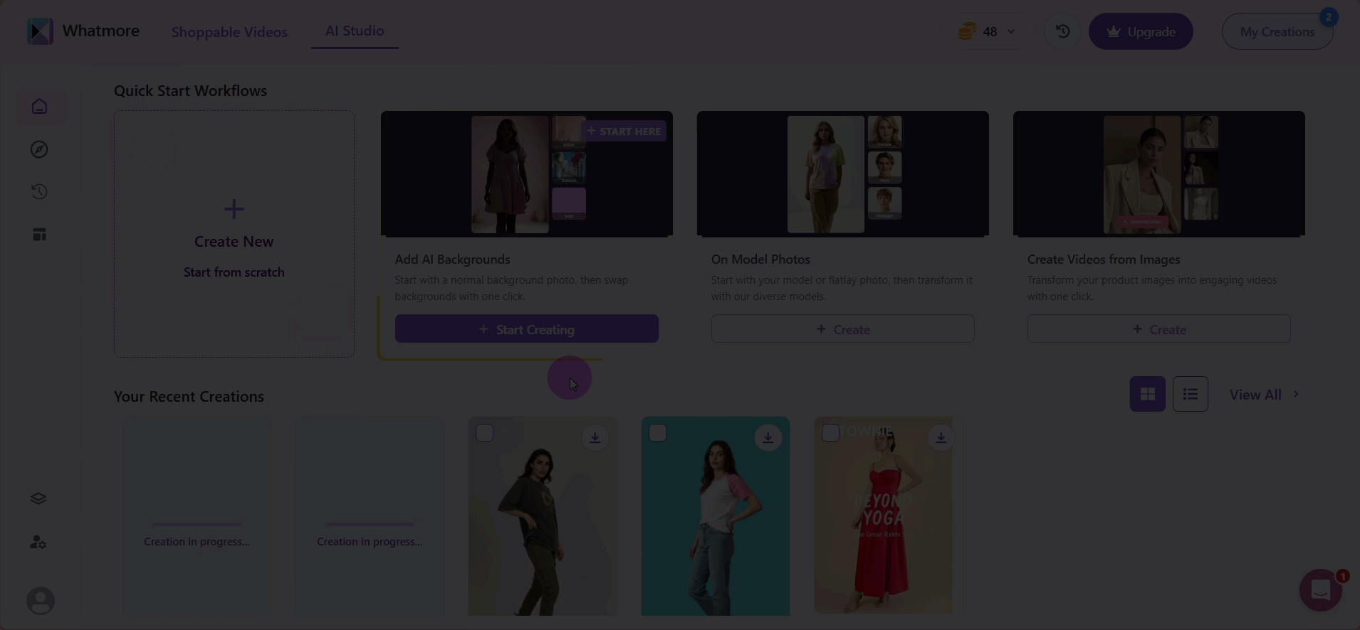 Log in to your Whatmore and click on the AI Studio tab. Ensuring that you are logged into your account allows you to track your projects, use your credits correctly, and access saved models, templates, and configurations.