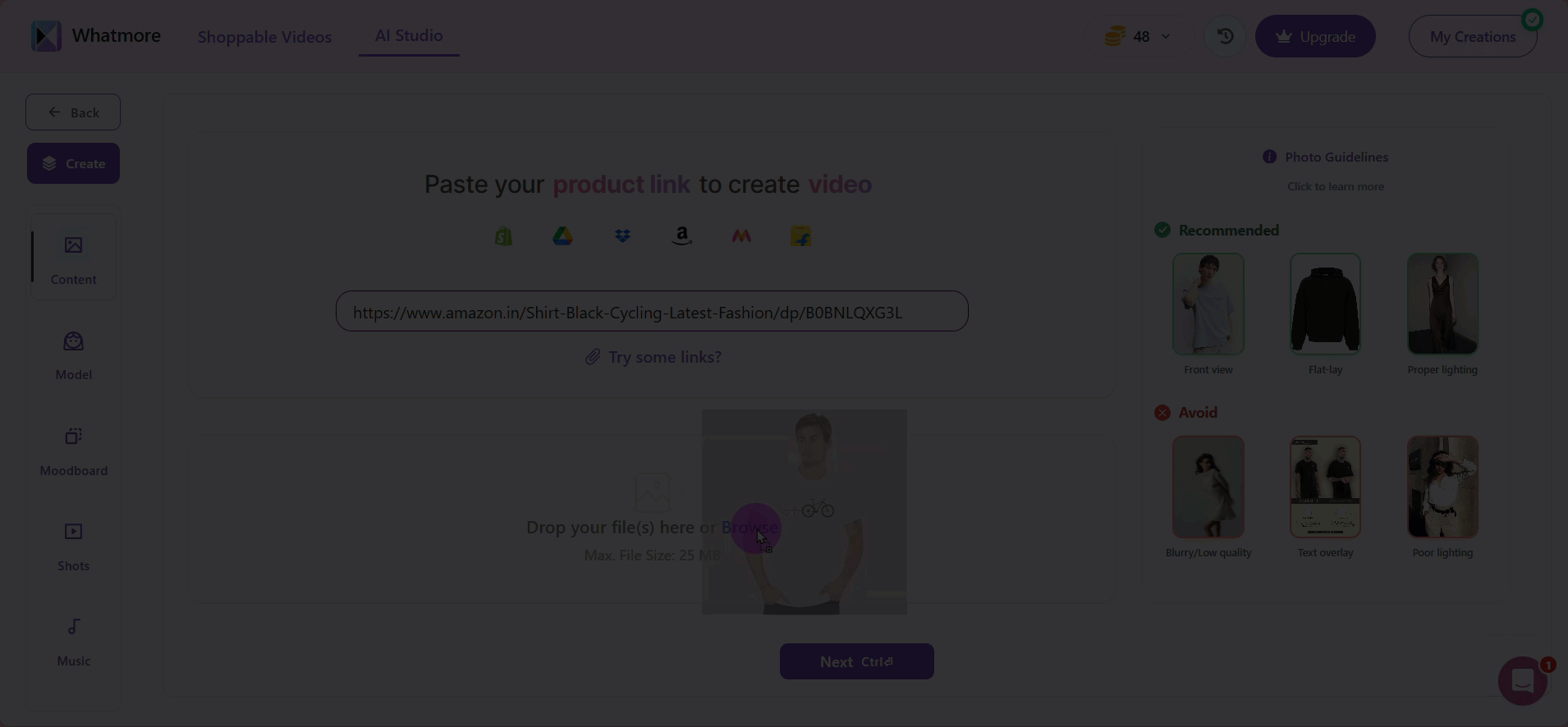 The URL must be from a supported platform (Shopify, Amazon, Flipkart, Myntra, Google Drive, Dropbox).