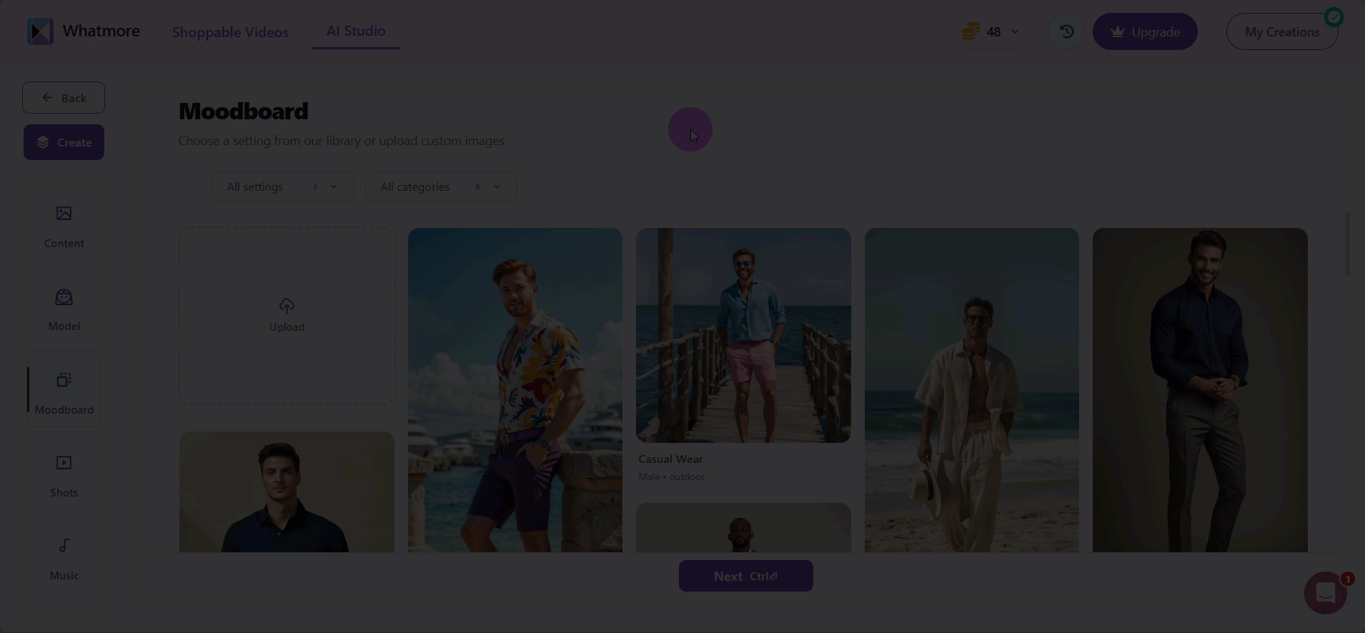 The mood board sets the visual scene for your video, placing your product in a context that enhances its appeal—whether that’s a bustling street, a minimalist studio, or a sunlit beach. By creating a consistent and engaging environment, your videos feel more professional and help viewers connect with the product. Before applying a mood board, review your brand guidelines and color palette to ensure the visuals align with your campaign’s style and messaging. To set your moodboard: