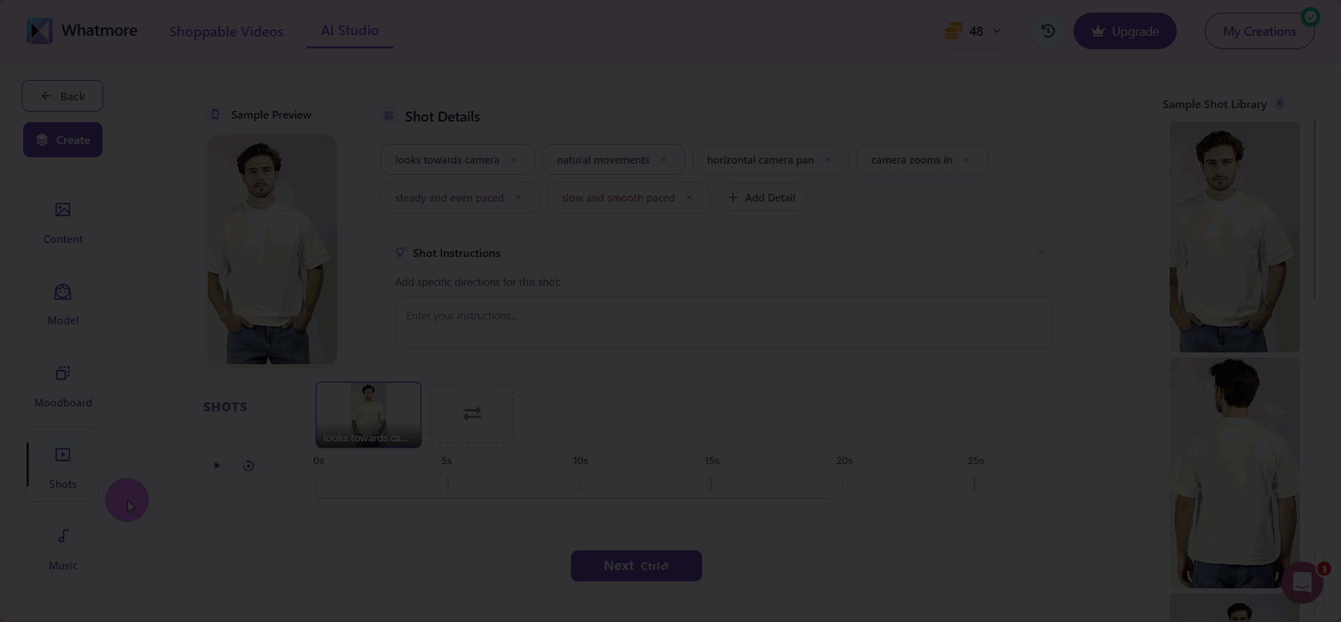 The Shots section lets you define how your video model will move and interact on screen. Here, you can select from pre-designed motions or pose sequences, such as walking, turning, sitting, or gesturing naturally, to best showcase your product.
